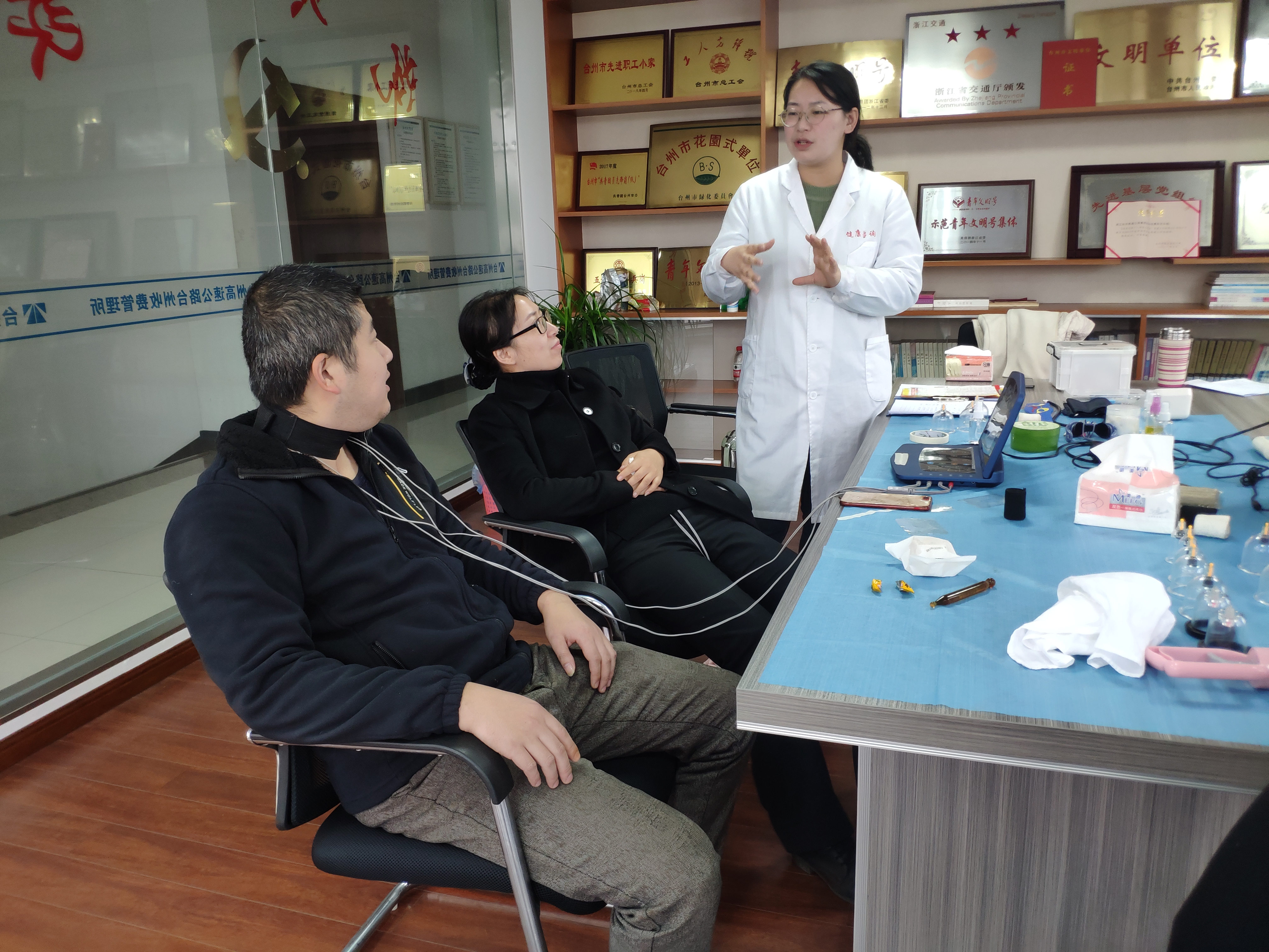圖為萬老師為咨詢人員理療 “你的頸椎有些僵,平時是不是會頭暈頭疼?”萬老師一邊按著小楊的頸椎一邊輕聲地問。 “對的,經常頭疼。” “低頭族的頭部容易供血不足,長期以往會得頸椎病的。來,我給你按一會,然后用理療儀針灸一會。” “老師,我想瘦一點,按哪里好?” “老師,我脫發比較厲害,怎么調理比較好?” 前來咨詢的員工都帶著問題等著萬老師給大家講解。現場氣氛熱烈,大家互相分享通過拔罐、按摩穴位、針灸理療感受瞬間變化。 中醫藥文化是我國的國粹,是中華民族優秀文化的瑰寶,與我們生活息息相關。這次活動讓全所員工了解“治未病”、認識“亞健康”、擺脫“亞健康”,在工作間隙獲得了更多健康知識,以更強健的身體投入工作。 楊雅芬